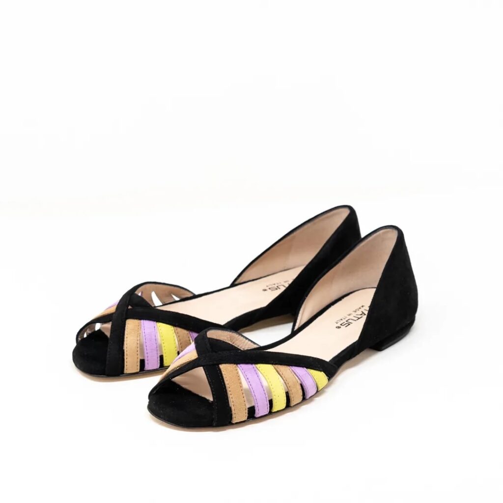 可愛い4色のカラーを黒で引き締めているのでまとまりがよく、合わせやすい一足に。