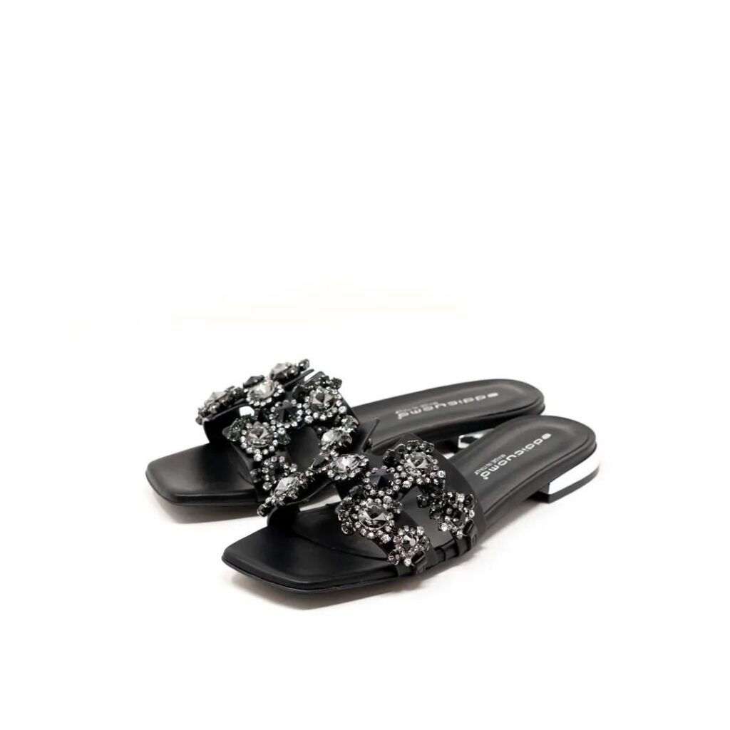 アッパーのストーンが輝きを放つ華やかなフラットミュール。