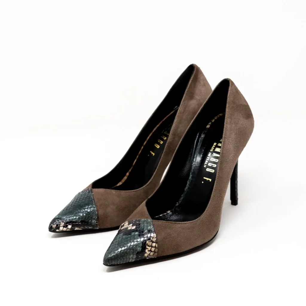 フロントとヒールにデザインされた、型押しのパイソンレザーが美しいパンプス。ベージュスエードと青みがかったパイソンレザーのコントラストがコーディネートのアクセントに。