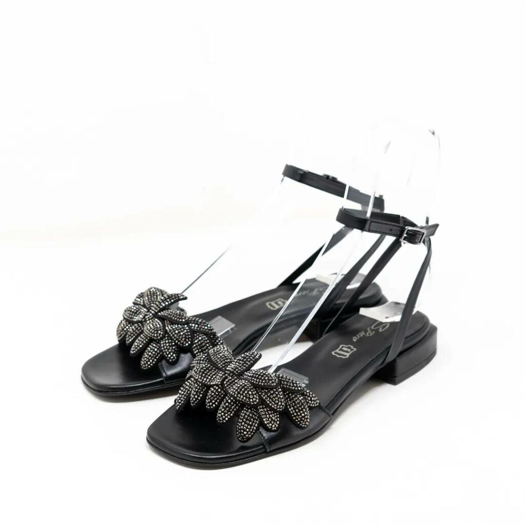 ブラックスワロで彩られた立体的なフラワーモチーフがエレガントなサンダル。