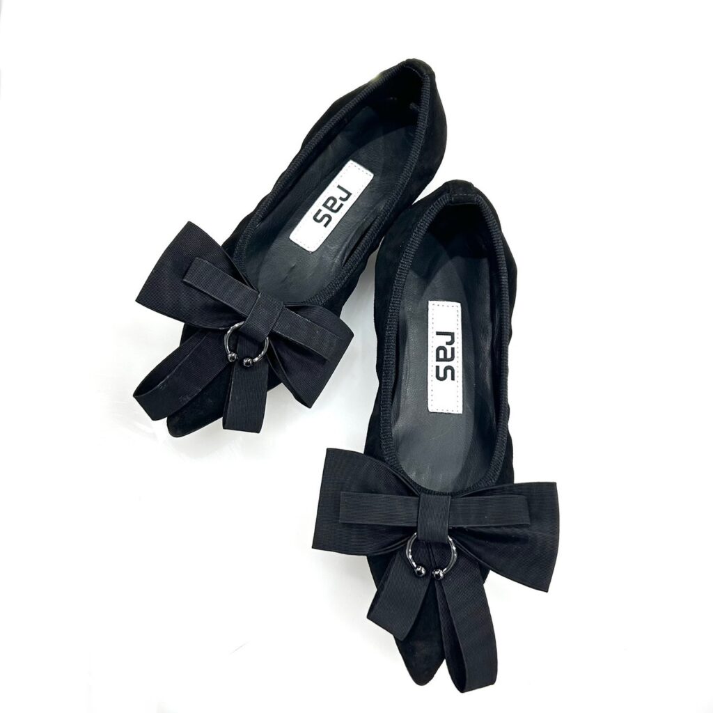 スエードブラックに大ぶりリボンがデコラティブな印象に。