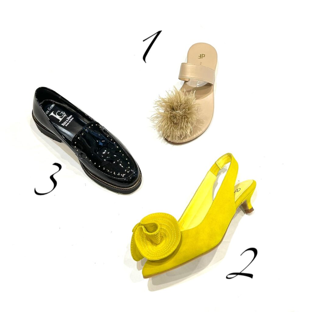 印象的なレモンイエローが目を引くバックスリングパンプス。
