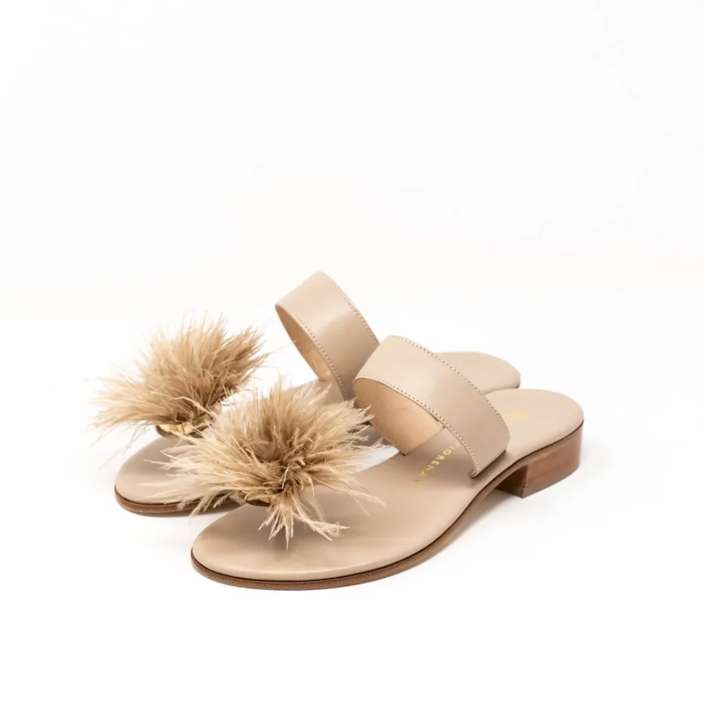 ベージュのフワフワのフェザーが印象的なサンダル。