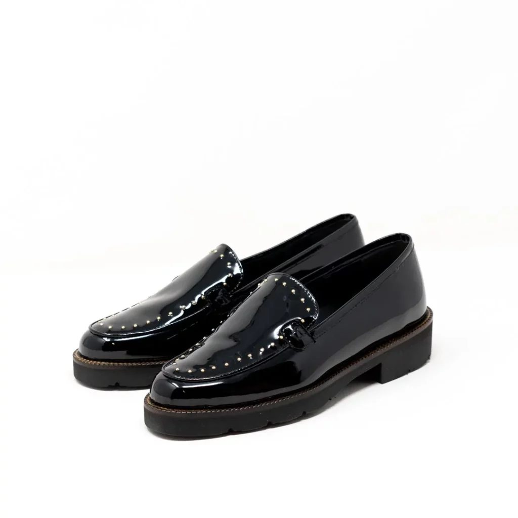 アッパーにぐるりとスタッズがあしらわれたオペラシューズ。