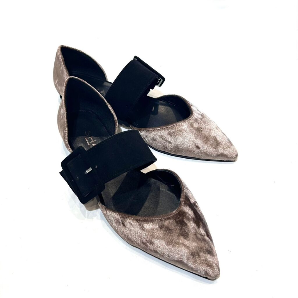 大胆なブラックベルトのコントラストが印象的なフラットシューズです。