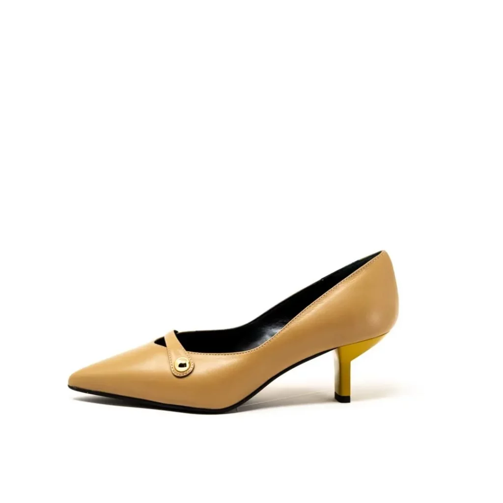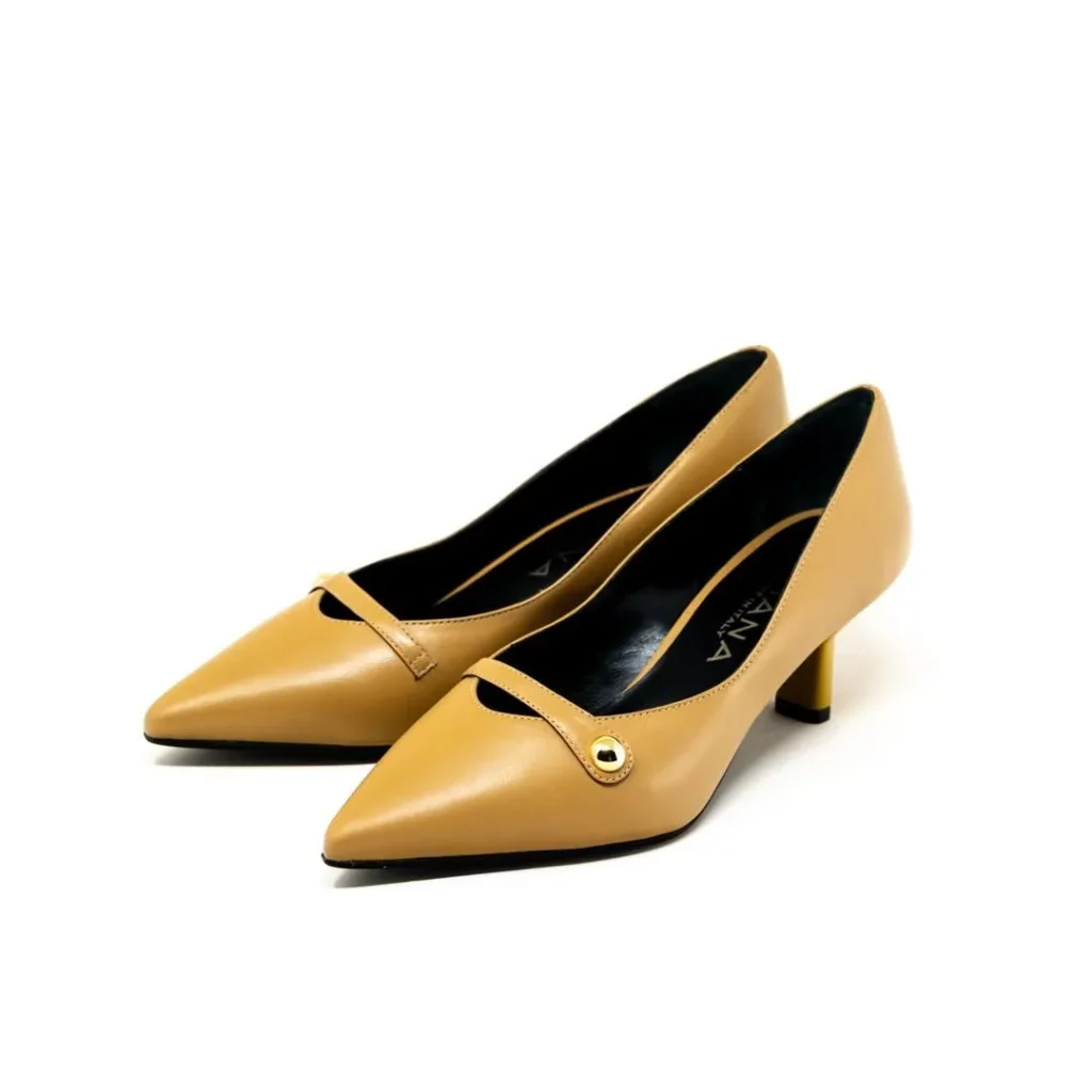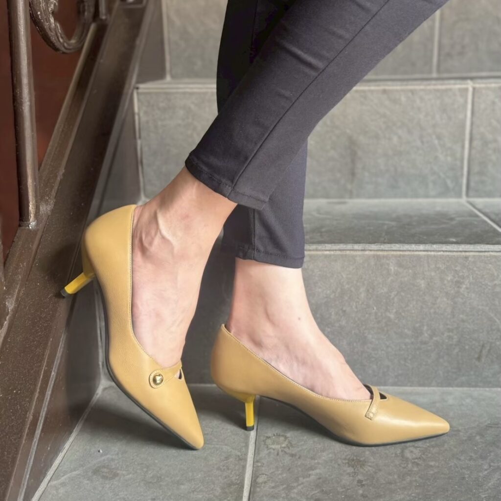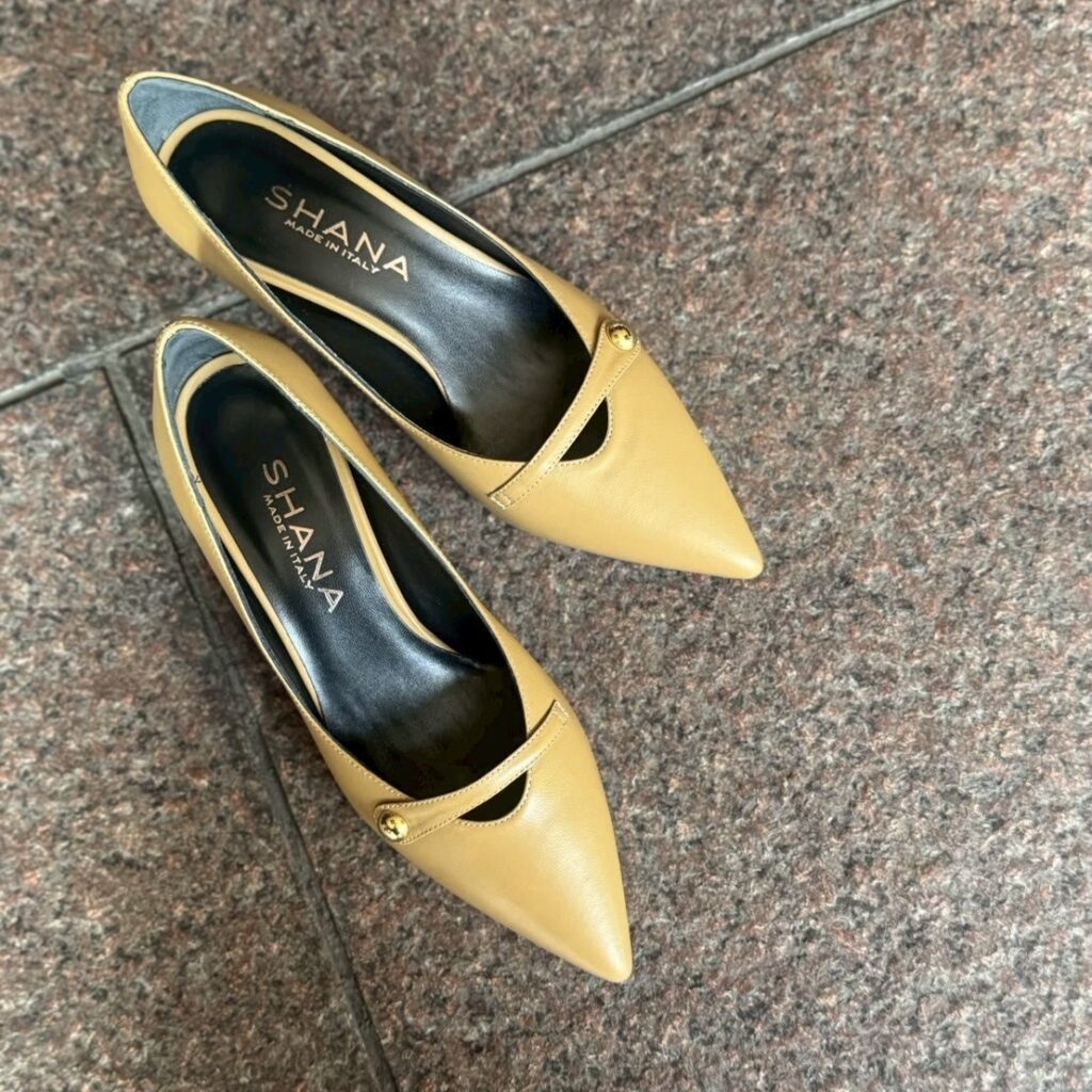 シャープなポインテッドトゥが女性らしい足元を演出し、甲にあしらわれたゴールドのボタンが上品なアクセントに😊