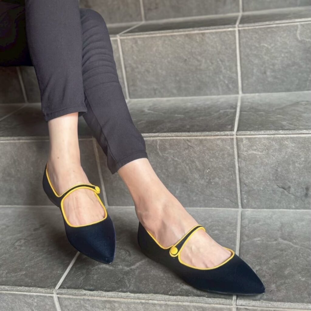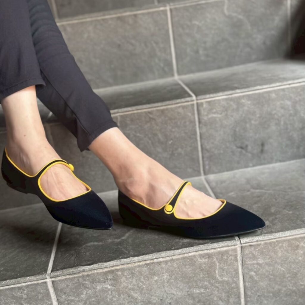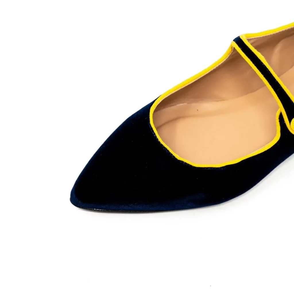 深みのあるネイビーカラーのベルベットに、鮮やかなイエローのトリミングが映えるポップで上品な一足✨✨✨