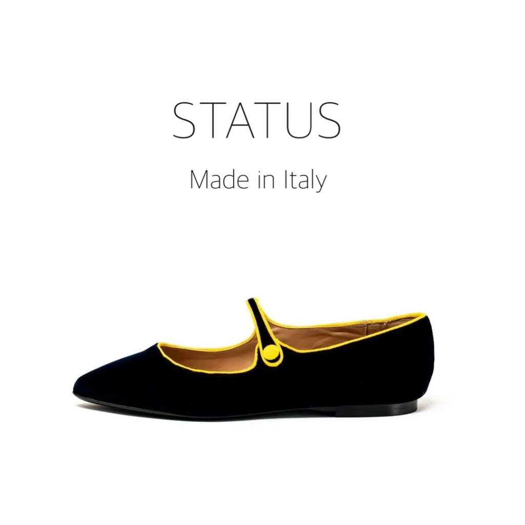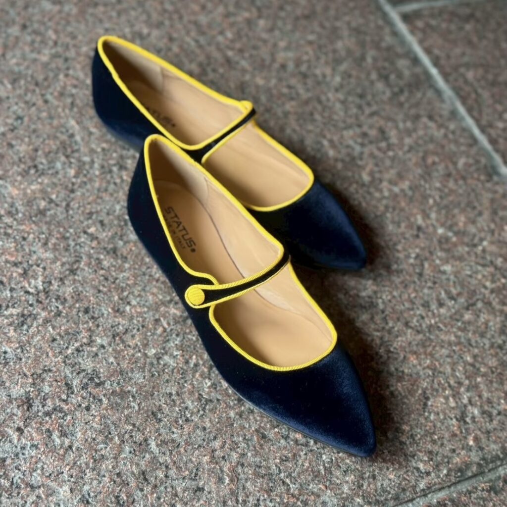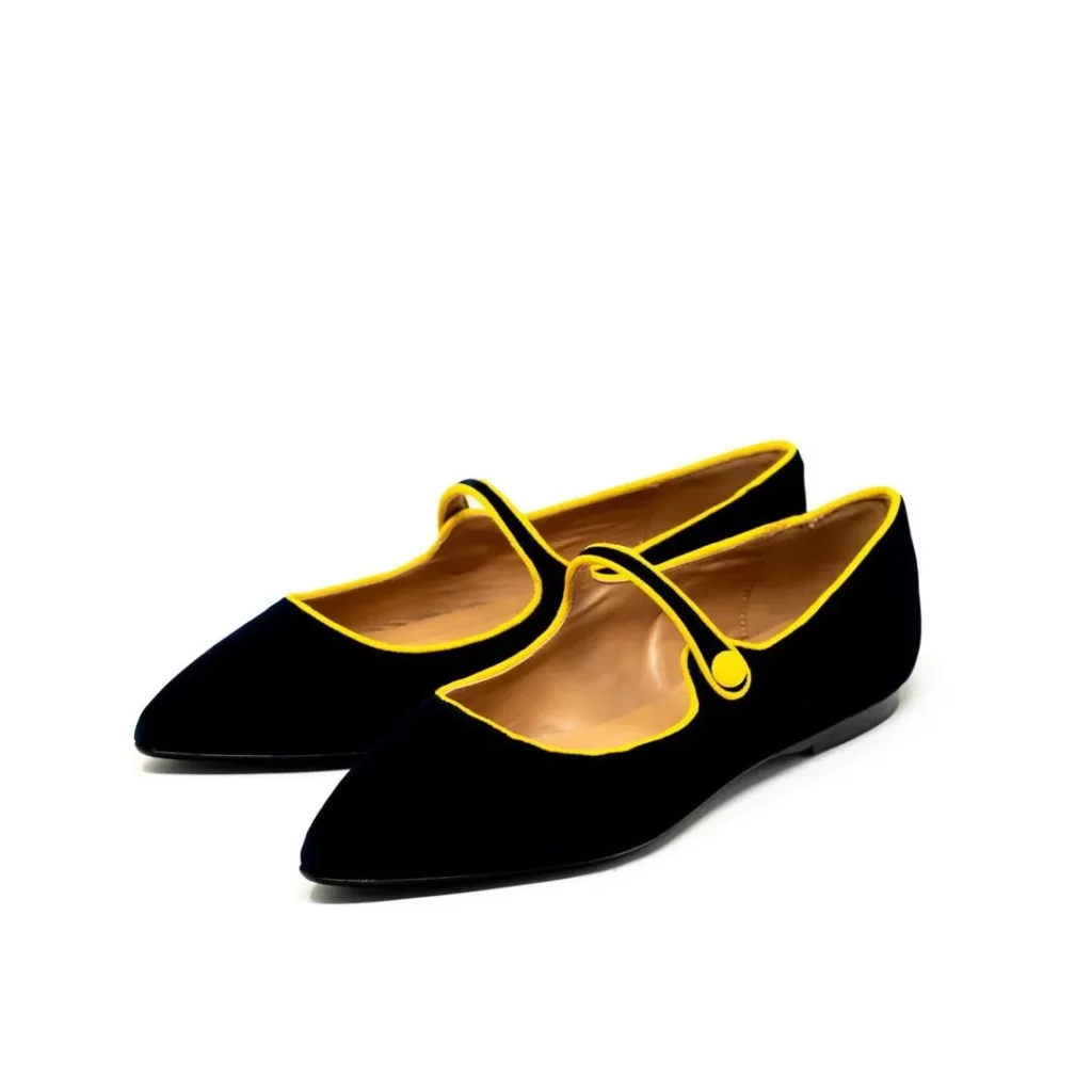 深みのあるネイビーカラーのベルベットに、鮮やかなイエローのトリミングが映えるポップで上品な一足✨✨✨