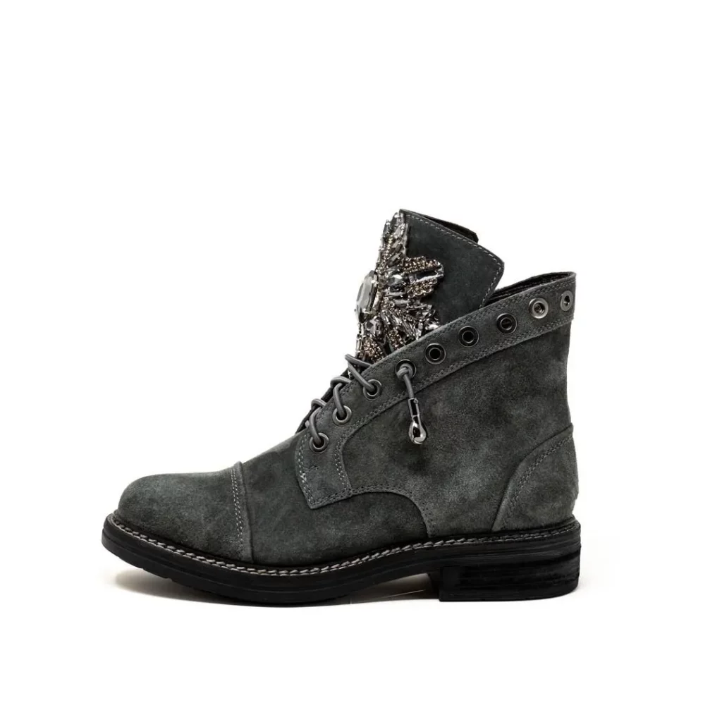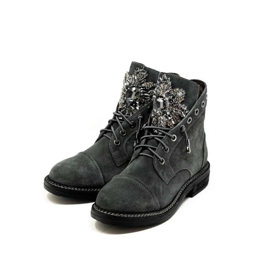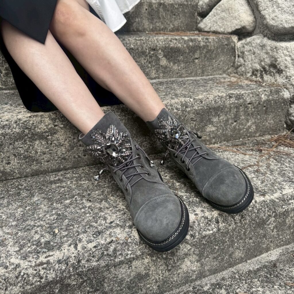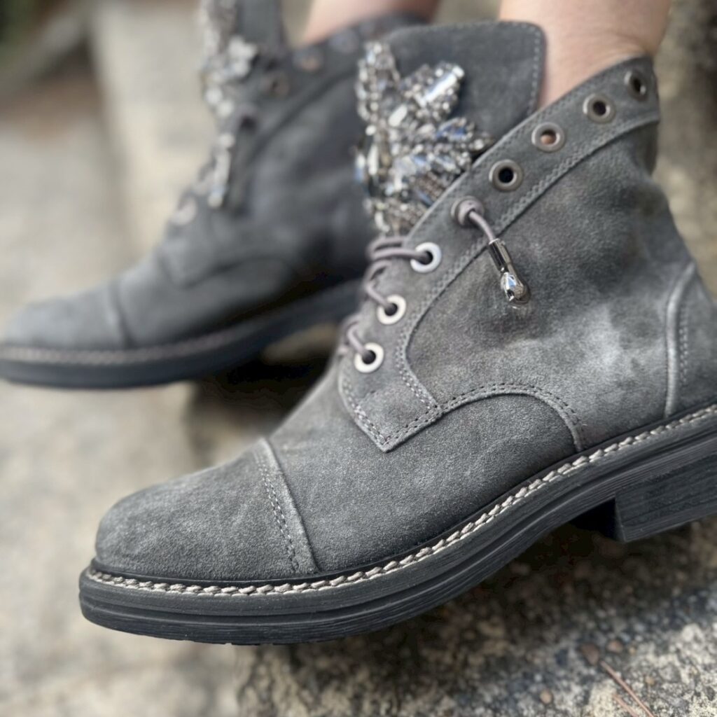 フロント部分の大きなストーン遣いが贅沢なグレーのトレッキングブーツが入荷して参りました✨✨✨