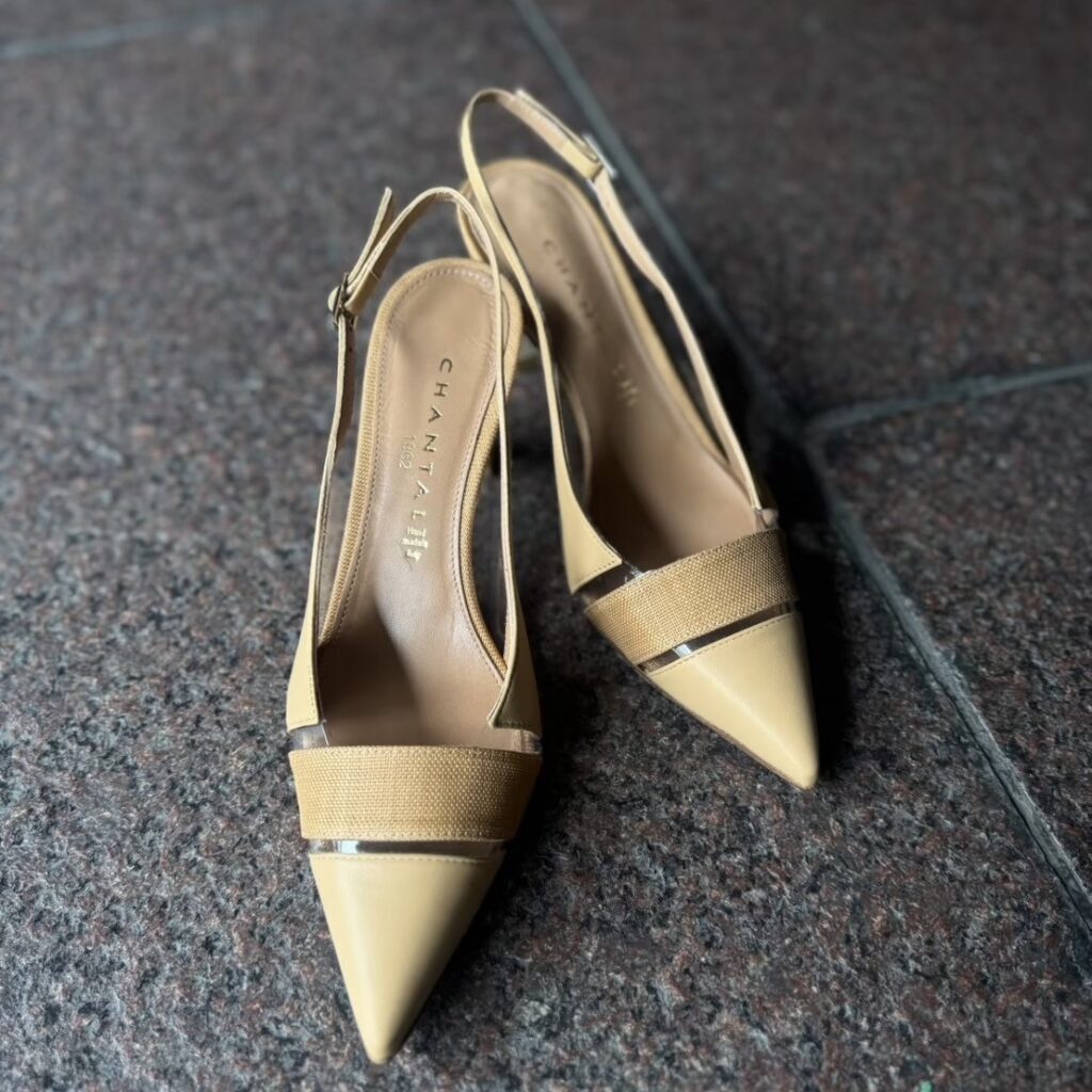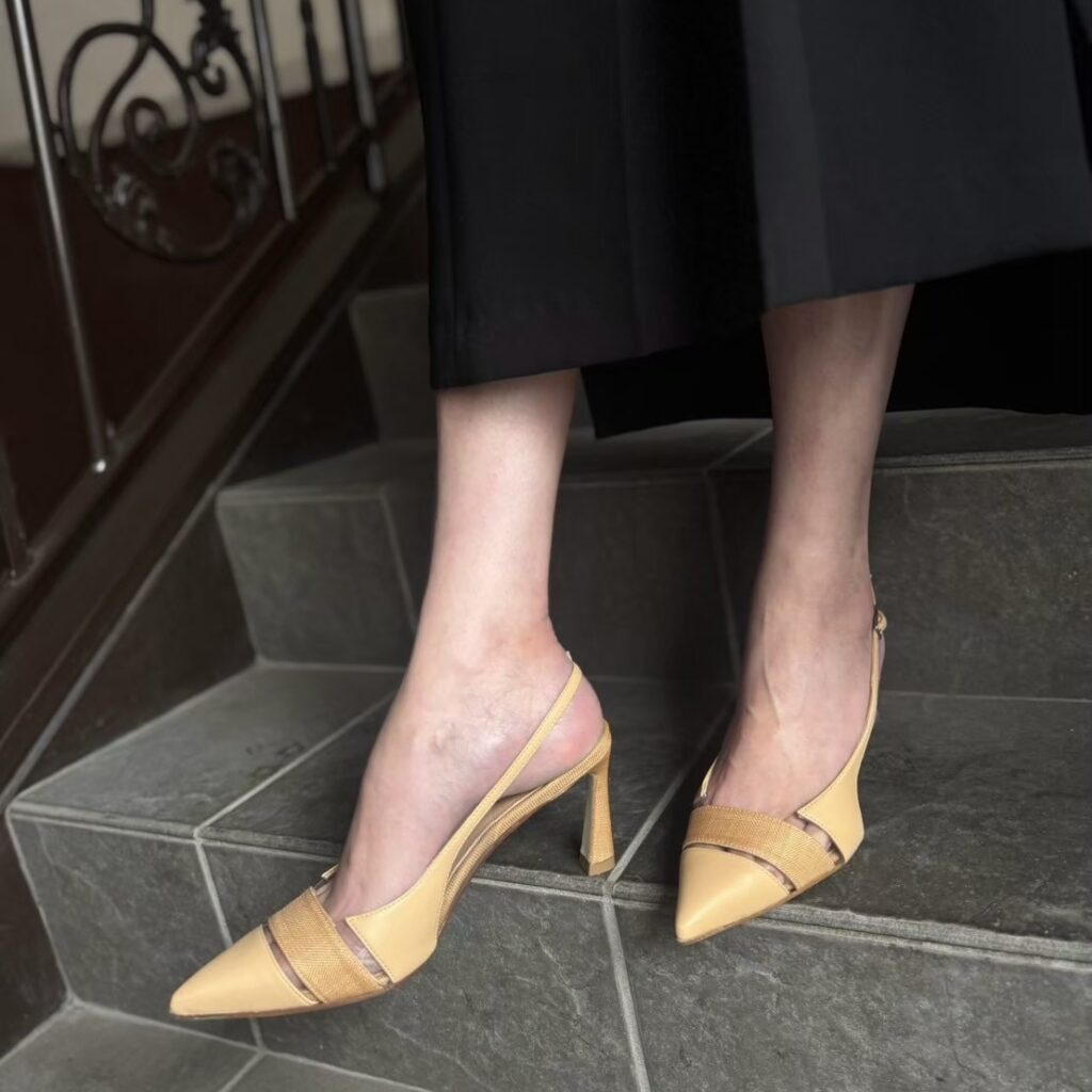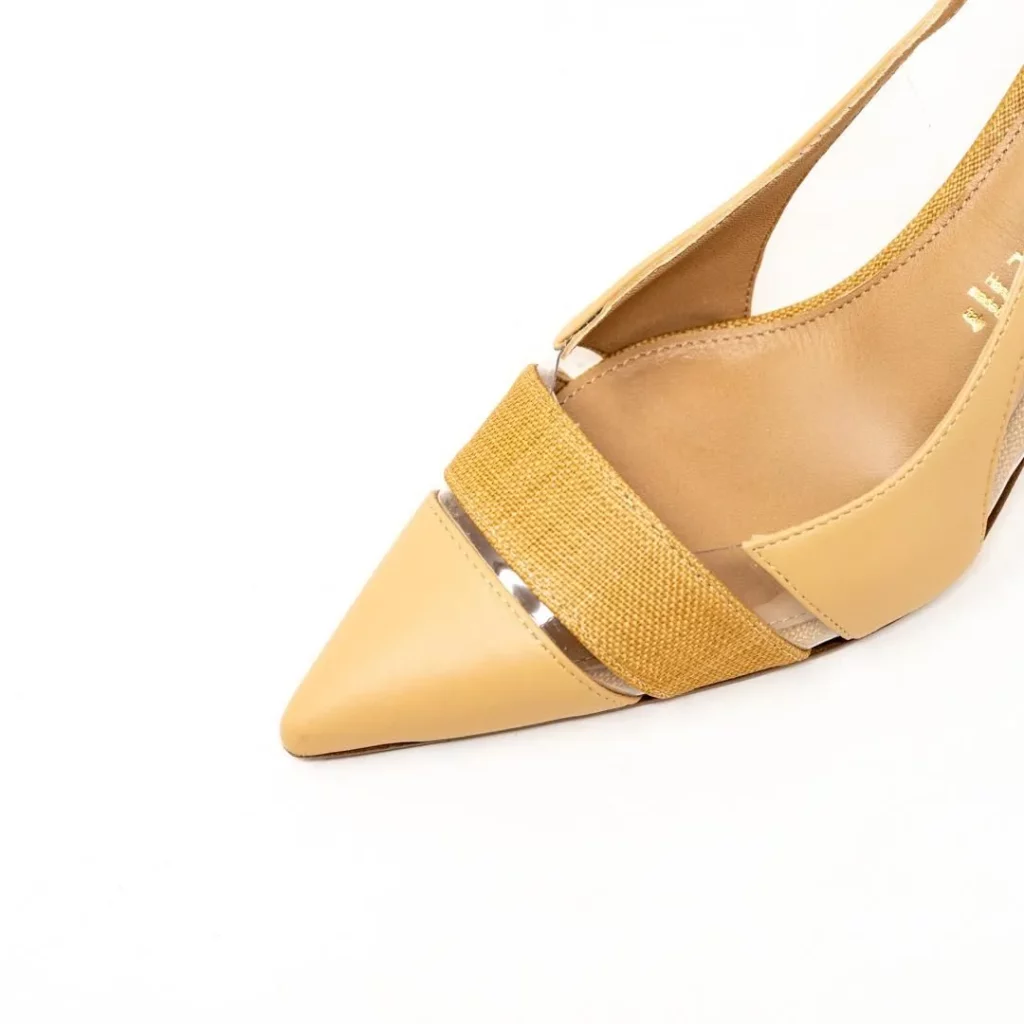 上質なベージュのレザーとラフィア、スケルトン素材がミックスされたポインテッドトゥパンプスです😊