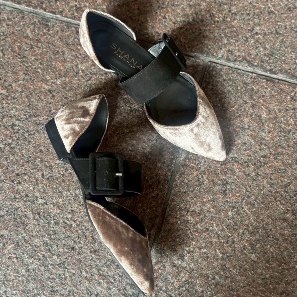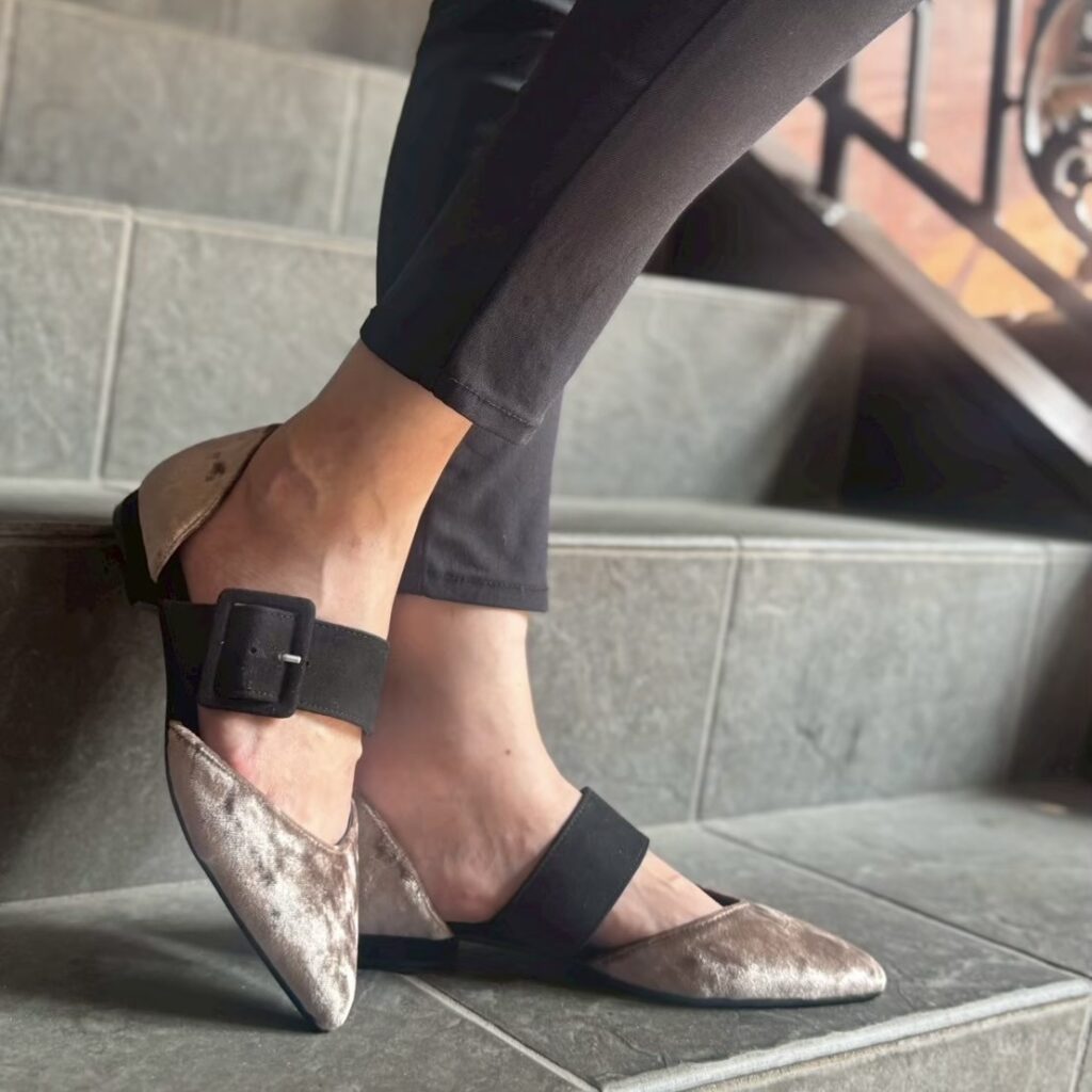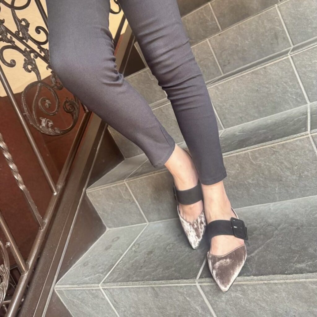 シャープなポインテッドトゥが足元をすっきりと見せつつ、存在感あるバックルデザインがモードなアクセントに😊