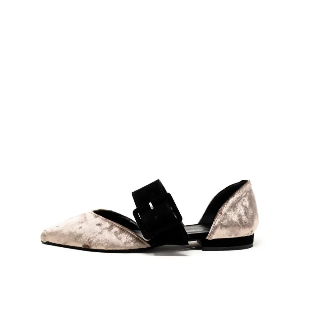 2/24艶やかなベロア素材に太めのベルトをデザインのポイントにしたフラットシューズ