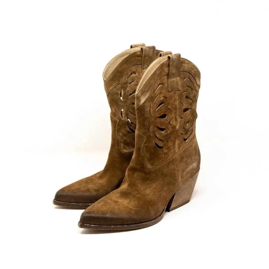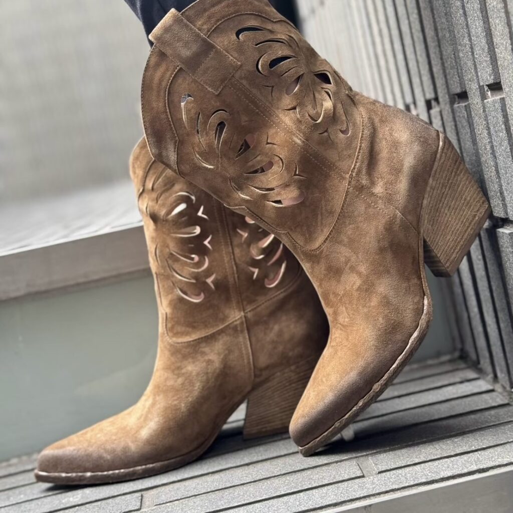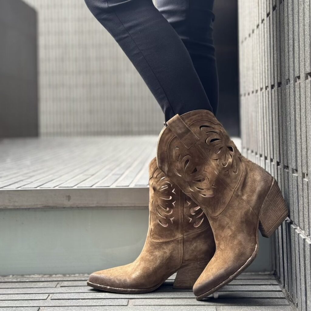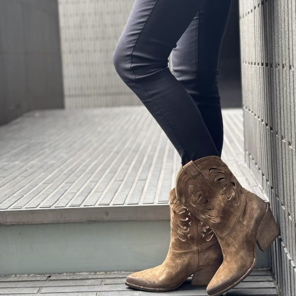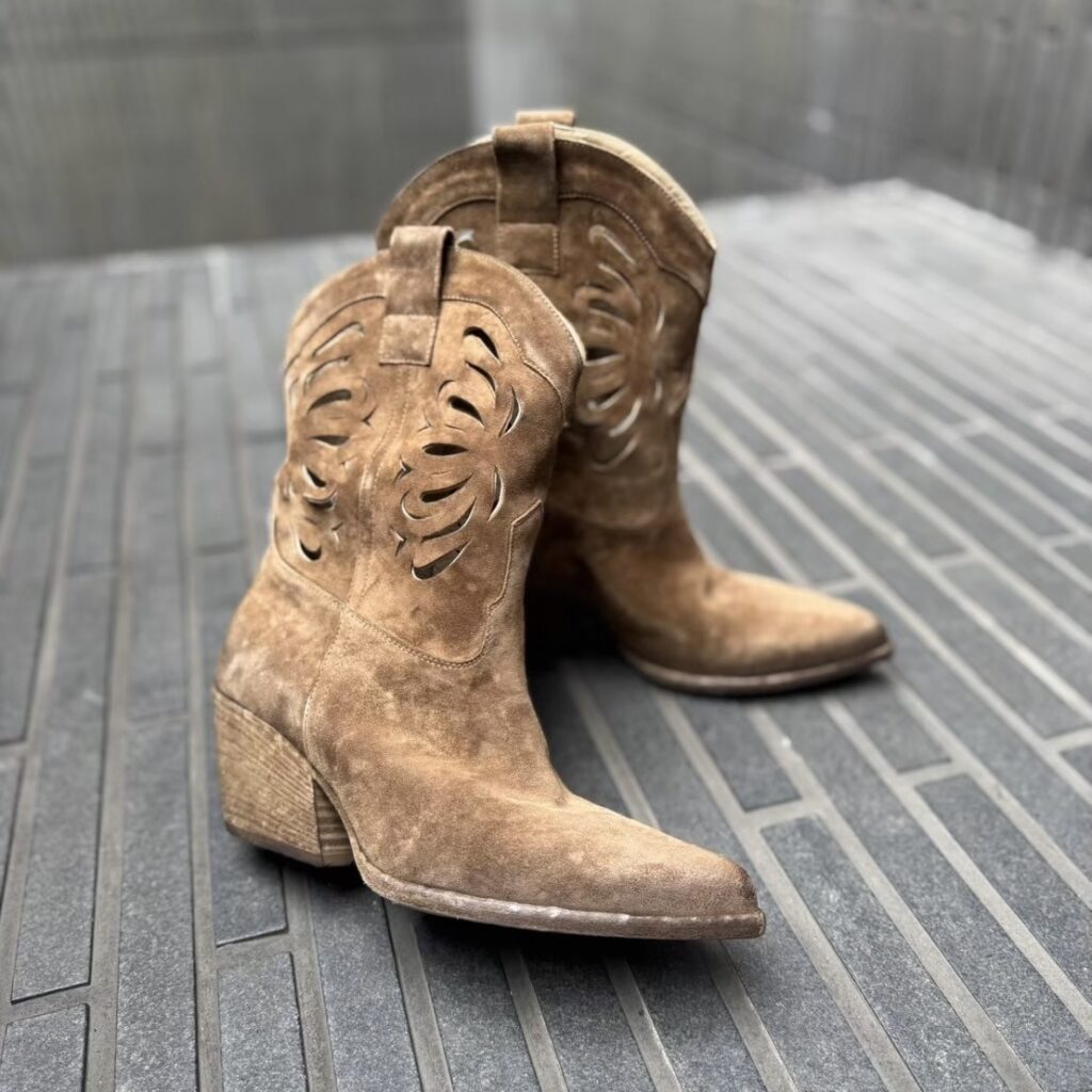 キャメルカラーのスエード素材が上品なウェスタンブーツです😊