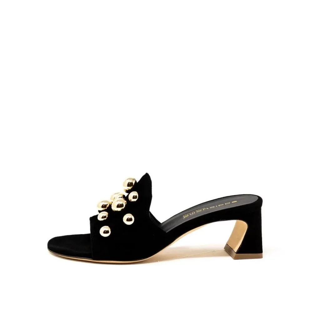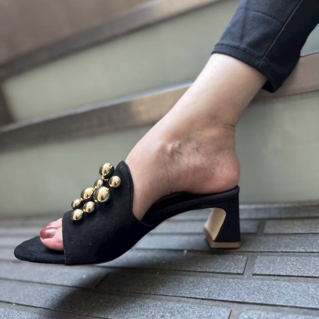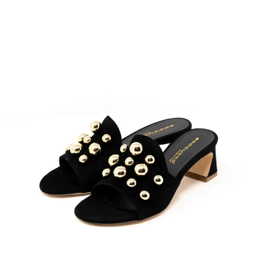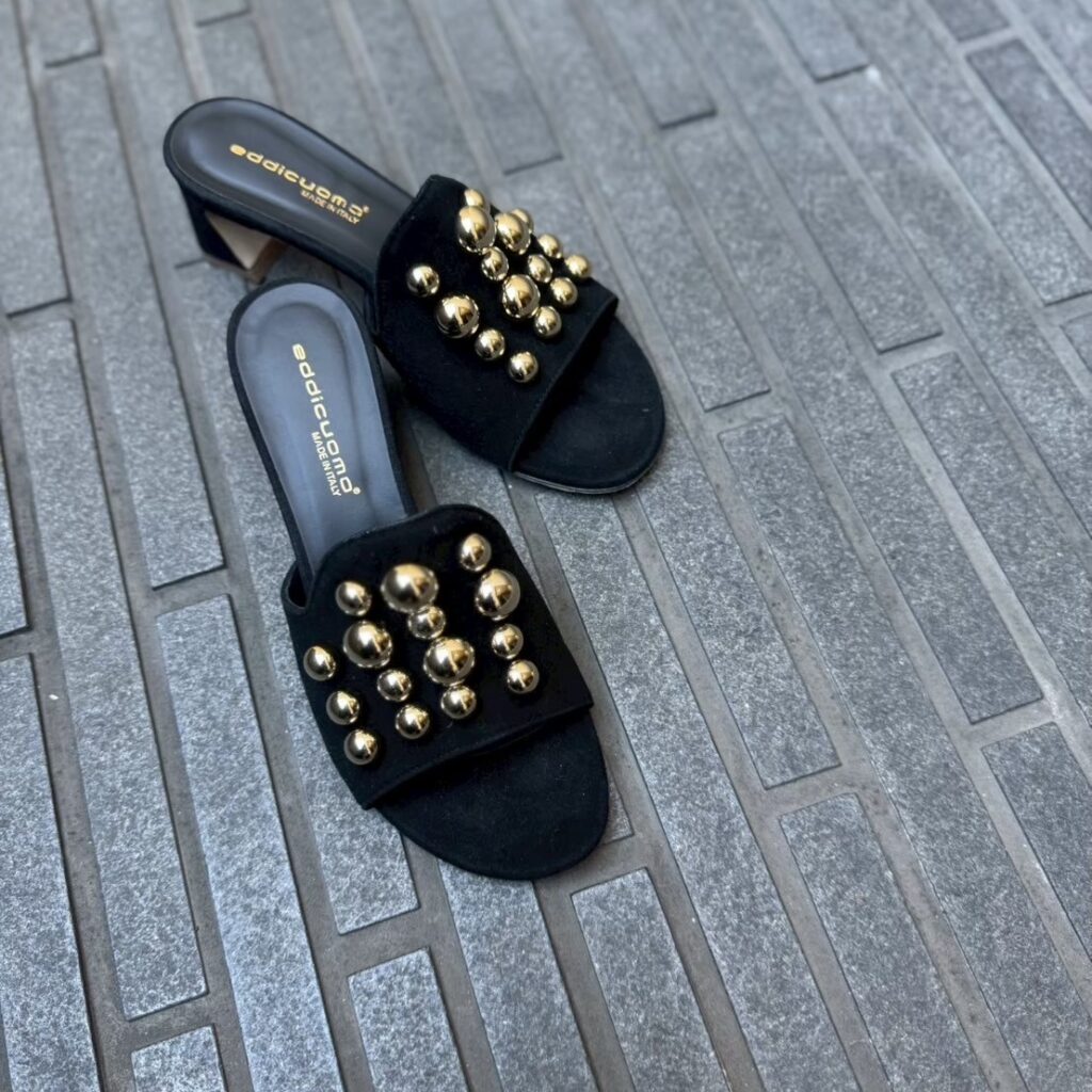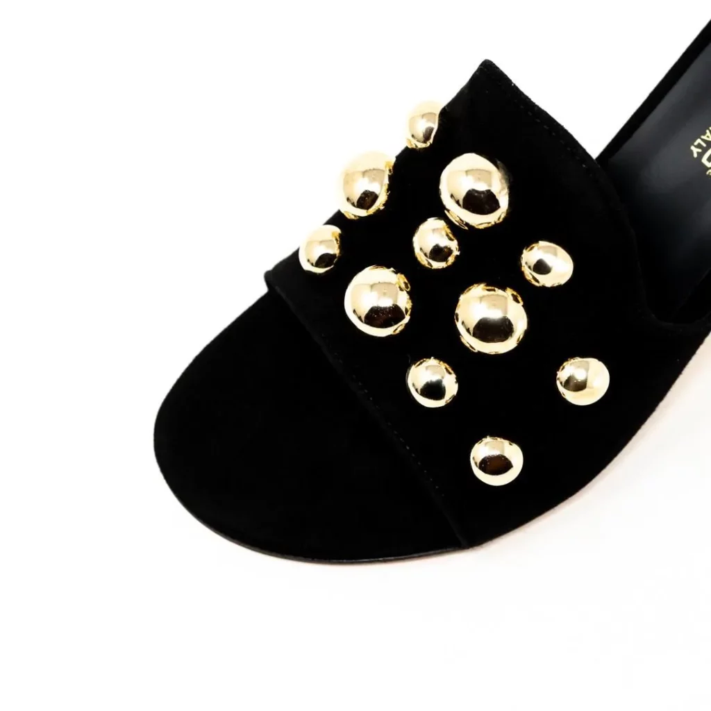 3/28インパクトあるボールスタッズがブラックカラーに映えるスエードミュール