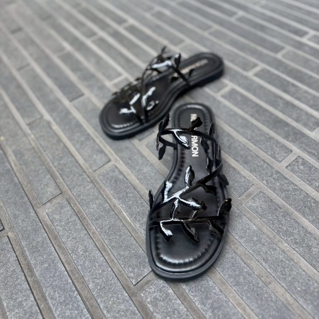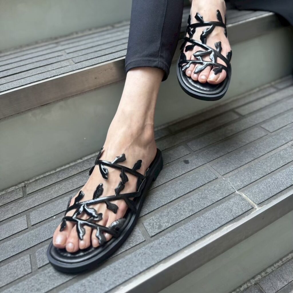 足入れすると肌の色と黒のリーフモチーフのコントラストが美しい一足です😊