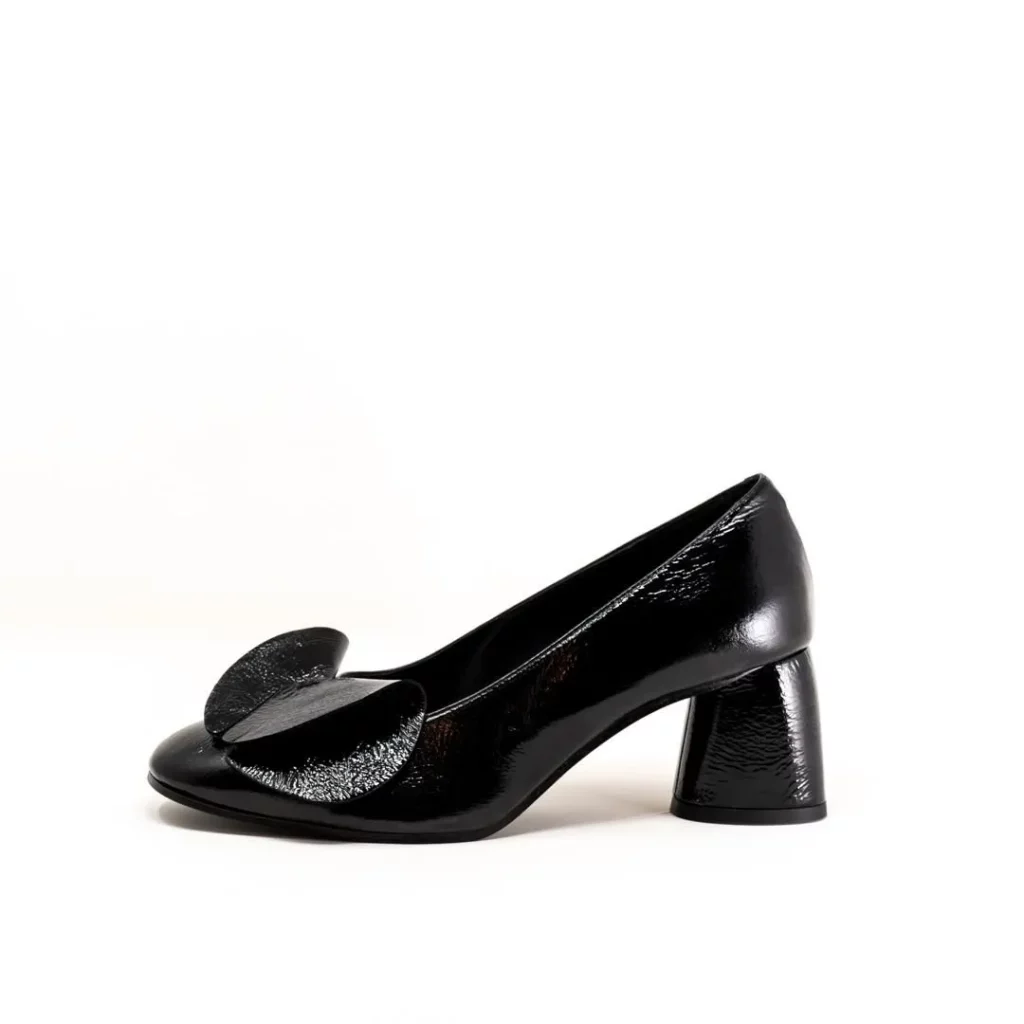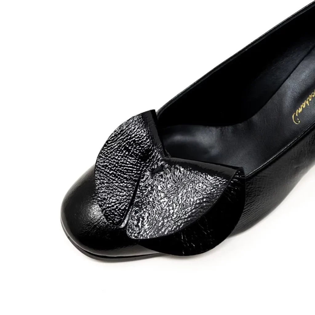 4/2艶感あるレザーに立体感あるモチーフでかっこよさと可愛さがミックスされたブラックカラーパンプス